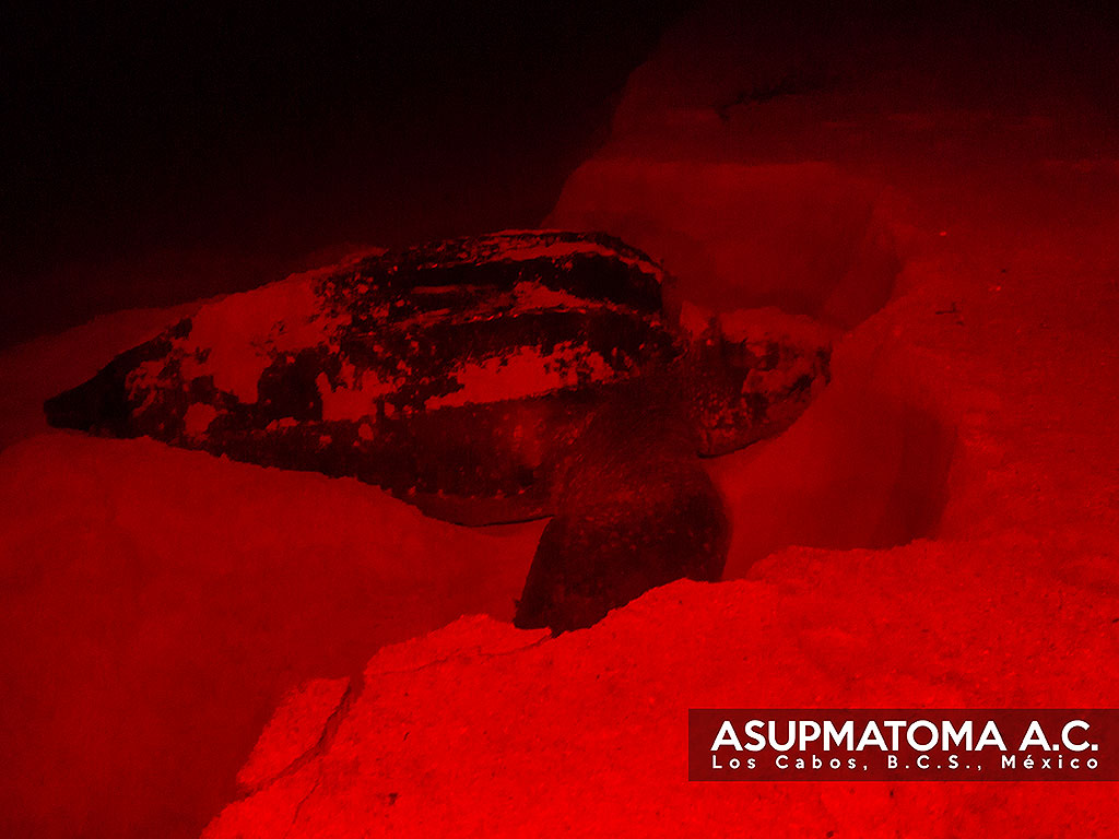 The leatherback turtle (Dermochelys coriacea) is the largest sea turtle species in the world. It does not have a hard shell like the others, since it belongs to different family (Dermochelyidae). In Mexico nesting is distributed mainly in Michoacán, Guerrero and Oaxaca. Its shell can reach up to 175 cm and weigh up to 500 kilograms. Its nesting season in the Eastern Pacific is from October – April. Currently, this species is considered critically endangered in the Eastern Pacific, thus the nesting of this species on the coasts of Baja California Sur is very scarce.